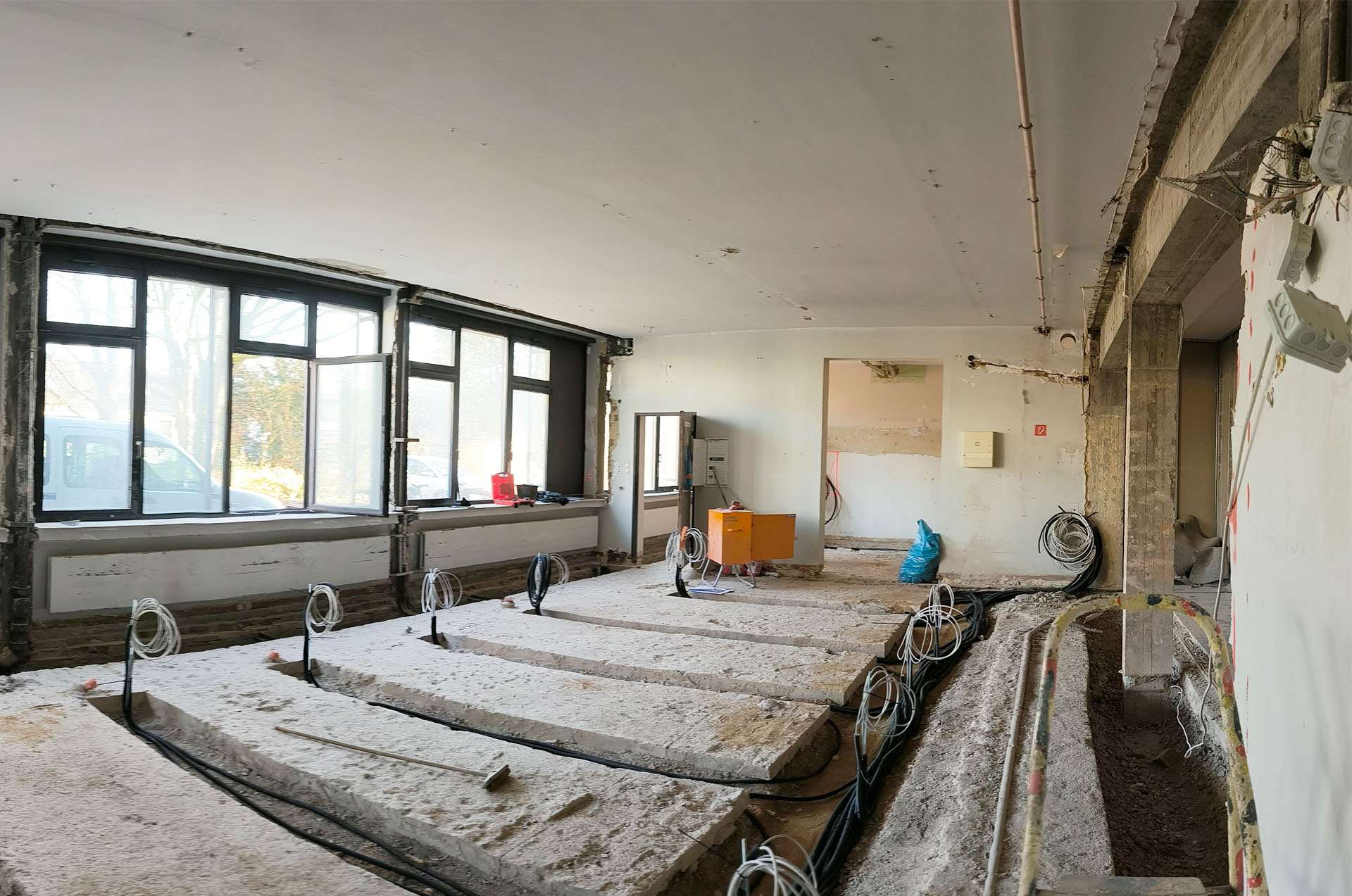 Der Ort der Erweiterung wurde bereits in der Vorstudie auf dem Dach des flacheren Gebäudeteils um den vorhandenen Lichthof gefunden. Hier befinden sich aktuell Räume für die Lehrer und die Verwaltung, sowie die naturwissenschaftlichen Klassen. Der Gebäudeteil umklammert einen höheren Klassentrakt, der als klassische Flurschule organisiert ist. Um die Aufstockung funktional in die Bestandsstruktur zu integrieren, ist eine zusätzliche Treppenanlage geplant. Durch den Einbau eines Aufzugs im Klassentrakt kann die fehlende Erschließbarkeit für Rollstühle für das gesamte Gebäude gelöst werden und damit weiterer Aachener Gebäudestand barrierefrei erschlossen werden. Durch die Aufstockung entstehen insgesamt sechs Klassenräume, von denen einer als Multifunktionsraum ausgestattet wird, drei Kursräume, drei Differenzierungsräume, ein Lernzentrum und zwei Lehrmittelräume. Die naturwissenschaftlichen Räume im Erdgeschoss und im Untergeschoss werden in gleicher Raumaufteilung saniert und mit neuen Geräten ausgestattet. Das neue Geschoss wird – nicht zuletzt aus statischen Gründen – als Holztafelwand-Bau umgesetzt. Diese sind besonders leicht und ermöglichen einen hohen Anteil an holzsichtigen Wandflächen. Der planerische Aufwand mündet in einem der nachhaltigen Bauweise entsprechenden Ergebnis.
