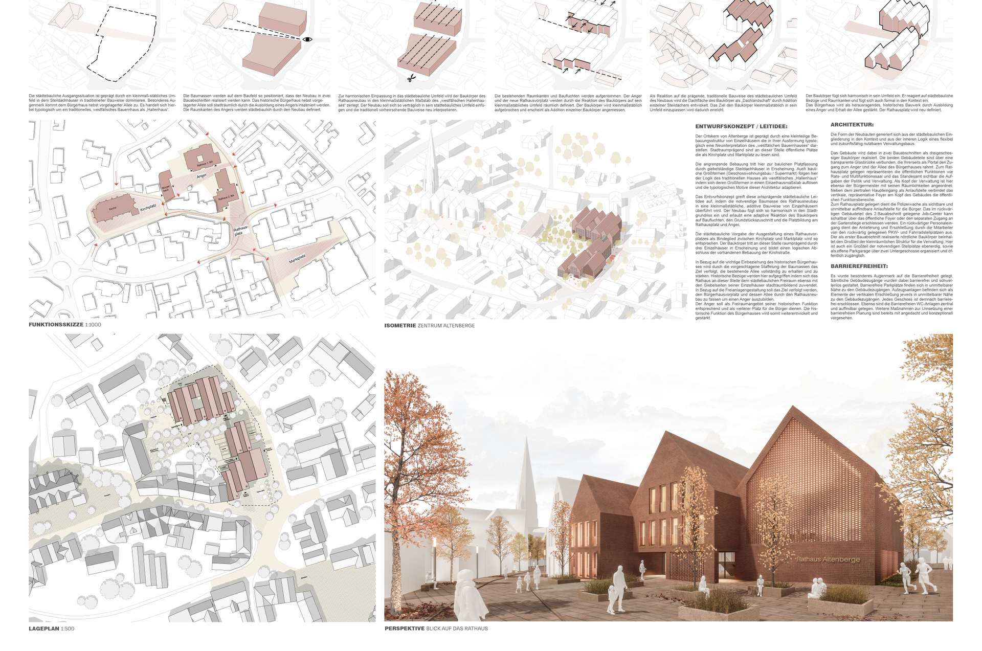 Die städtebauliche Ausgangssituation ist geprägt durch ein kleinmaßstäbliches Umfeld, in dem Steildachhäuser in traditioneller Bauweise dominieren. Besonderes Augenmerk kommt dem Bürgerhaus nebst vorgelagerter Allee zu. Es handelt sich hierbei typologisch um ein traditionelles, westfälisches Bauernhaus als „Hallenhaus“. Zur harmonischen Einpassung in das städtebauliche Umfeld wird der Baukörper des Rathausneubau in den kleinmaßstäblichen Maßstab des „westfälischen Hallenhauses“ zerlegt. Der Neubau soll sich so verträglich in sein städtebauliches Umfeld einfügen und die traditionell vorherrschende Bauweise neu interpretieren. Die Form der Neubauten generiert sich aus der städtebaulichen Eingliederung in den Kontext und aus der inneren Logik eines flexibel und zukunftsfähig nutzbaren Verwaltungsbaus. Das Gebäude wird dabei in zwei Bauabschnitten als dreigeschossiger Baukörper realisiert. Die beiden Gebäudeteile sind über eine transparente Glasbrücke verbunden, die ihrerseits als Portal den Zugang zum Anger und der Allee des Bürgerhauses rahmt.